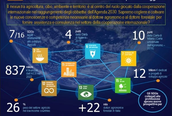 Il nexus tra agricoltura, cibo, ambiente e territorio è al centro del ruolo giocato dalla cooperazione internazionale nel raggiungimento degli obbiettivi di sviluppo sostenibile inclusi nell’Agenda 2030 approvata dall’ONU. Il Consiglio Nazionale dell'Ordine dei Dottori Agronomi e dei Dottori Forestali, attraverso la Carta Universale dell'Agronomo (2015) e la Carta di Matera (2019), esprimono l'impegno della nostra professione in questa direzione.